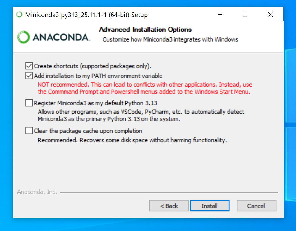 PATHsystem variable. Although the installer does not recommend doing it, we strongly recommend doing so. If you want more info about what thePATHvariable is and how it works, refer to the callout we made at the beginning of the section. After deciding whether you want to add Conda toPATHor not, click on Next and install Conda;